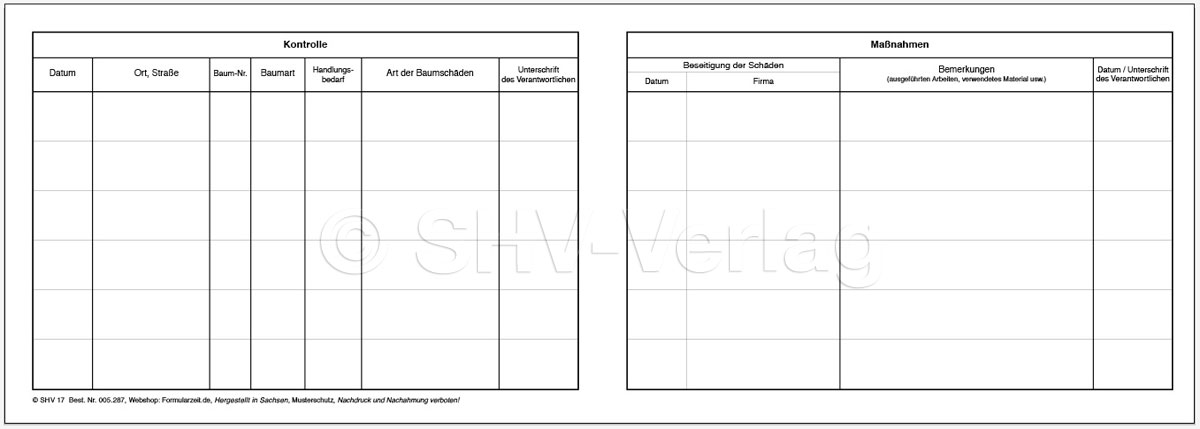Baumkontrollbuch für Bäume an Straßen, Wege und Plätze, DIN A5, tabellarisch