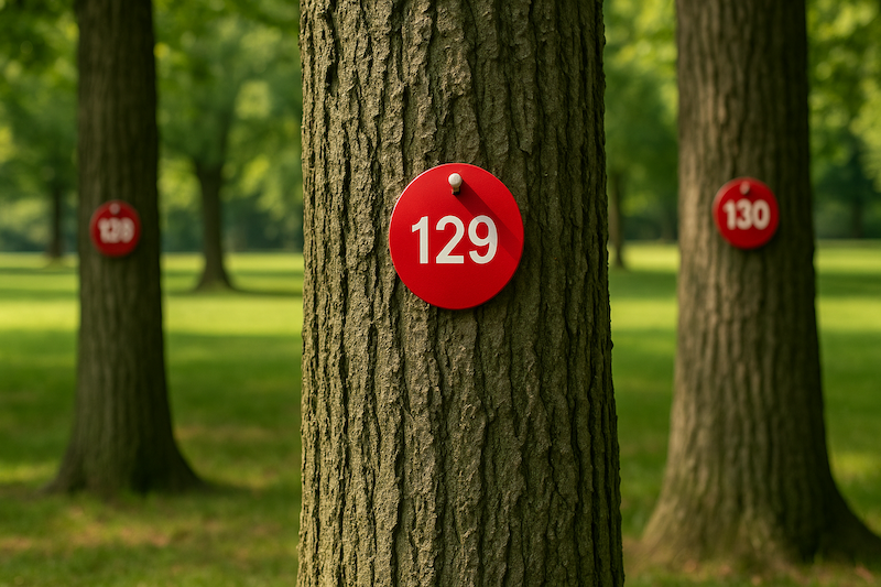 Baummarken und Baumplaketten aus eloxiertem Aluminium, ø 40 mm, mit einer Stärke von 1 mm. Diese robusten Plaketten sind laserbeschriftet und ideal zur dauerhaften Baumnummerierung und -kennzeichnung in Forstwirtschaft und Gartenbau. Es handelt sich bei diesem Artikel um eine Sonderanfertigung.